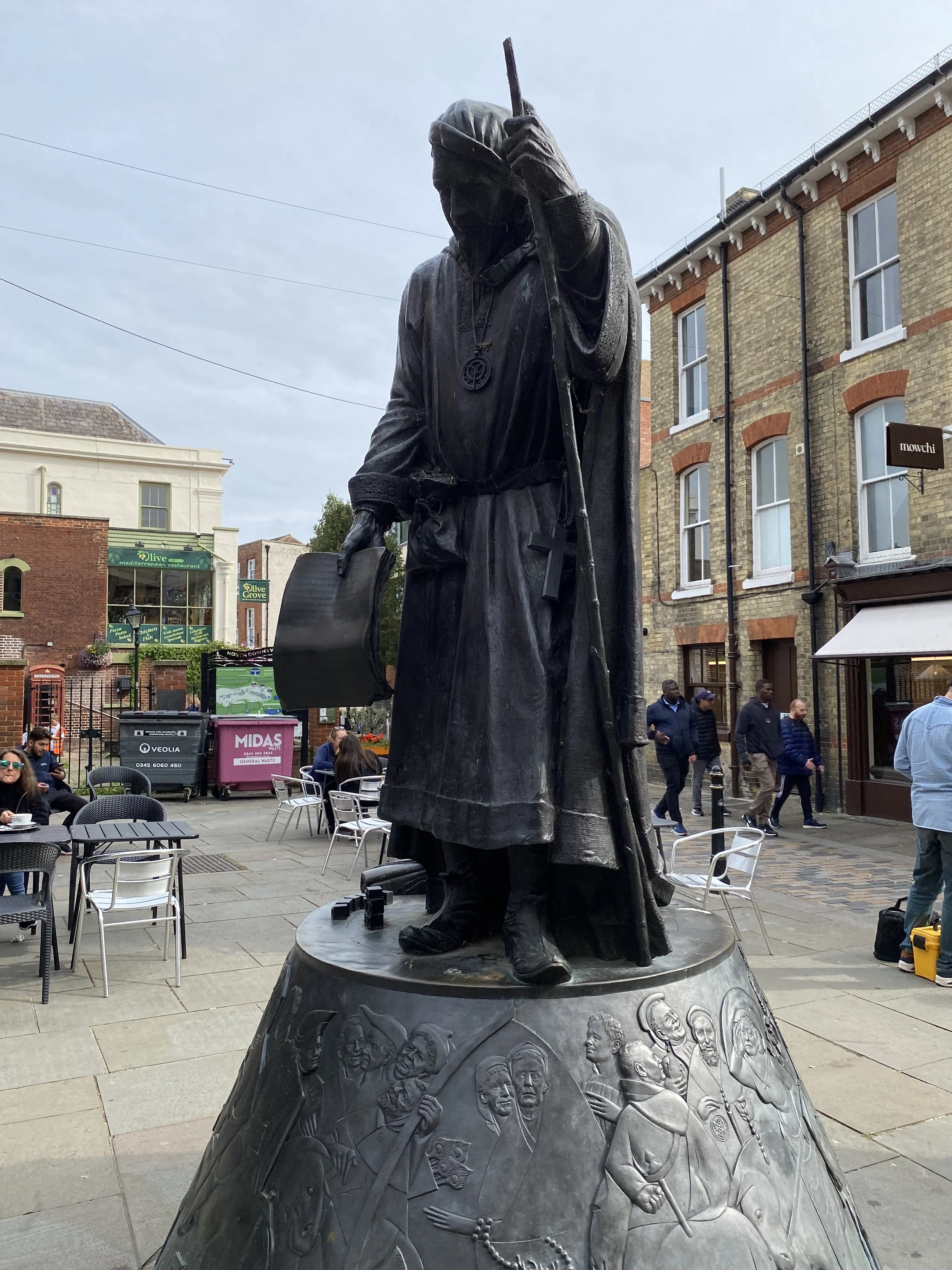 The plinth on which Chaucer stands is in the shape of a horse’s hoof and shows images relating the the Canterbury Tales, including a depiction of the Tabard Inn in Southwark from where the pilgrims set off on their journey. Each character is depicted as a local person and a list of sponsors shows those who contributed to the project.