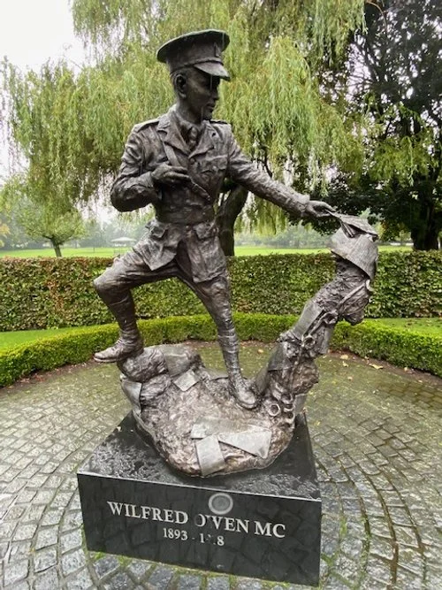 Designed by local artist Tim Turner, a life-sized, bronze statue of Owen was unveiled on the morning of 20th October, 2018. It is is adorned with the words of Owen, handwritten by local primary school children, along with five original poems, contributed by pupils from local schools.