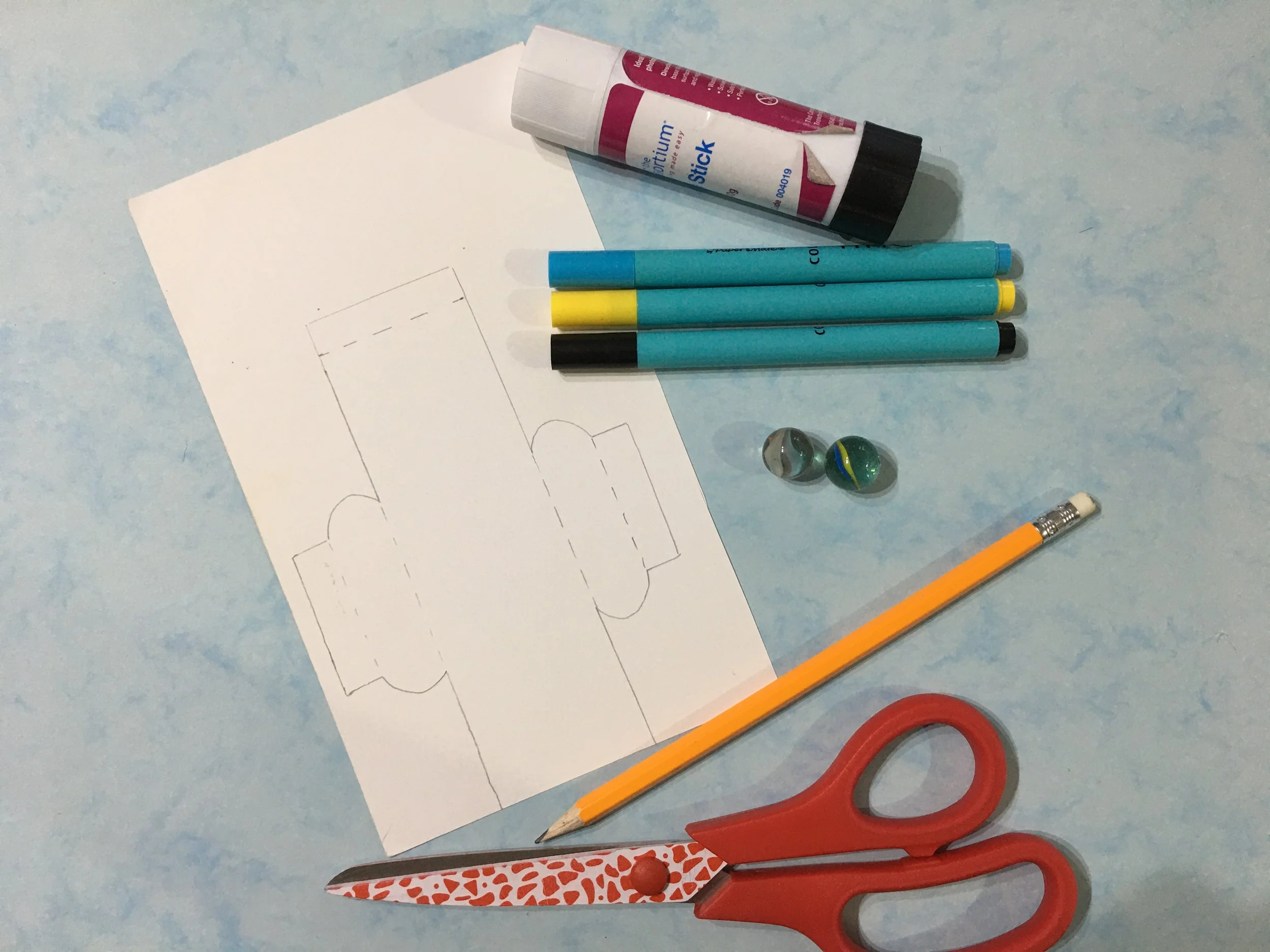 Fold the net around and stick on to the two side tabs to make a little pocket. Put the two marbles inside and glue down the final flap to close the toy. Now your genie is ready to tumble!