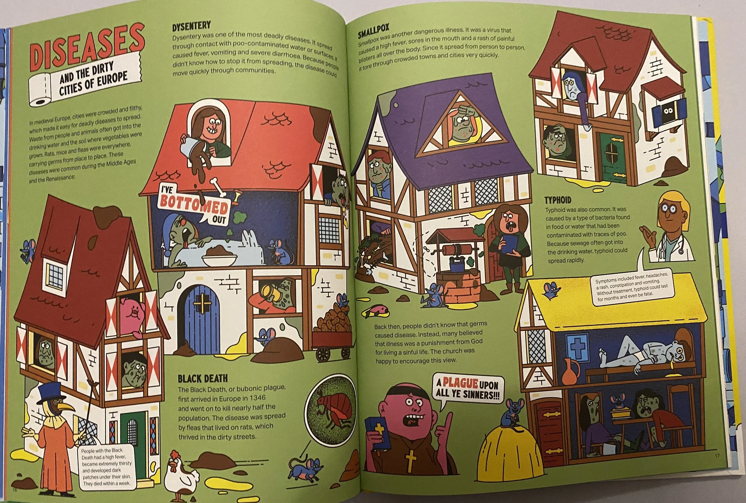 Having started with a focus on poo entitled ‘Ew Gross!’ which explains not only what it is, but also why we find it so distasteful, the author moves on to a look at poo through the ages from prehistoric to modern times. Developments in toilet technology across the world are covered as well as the devastating impact of the deadly diseases spread by dirty living conditions.