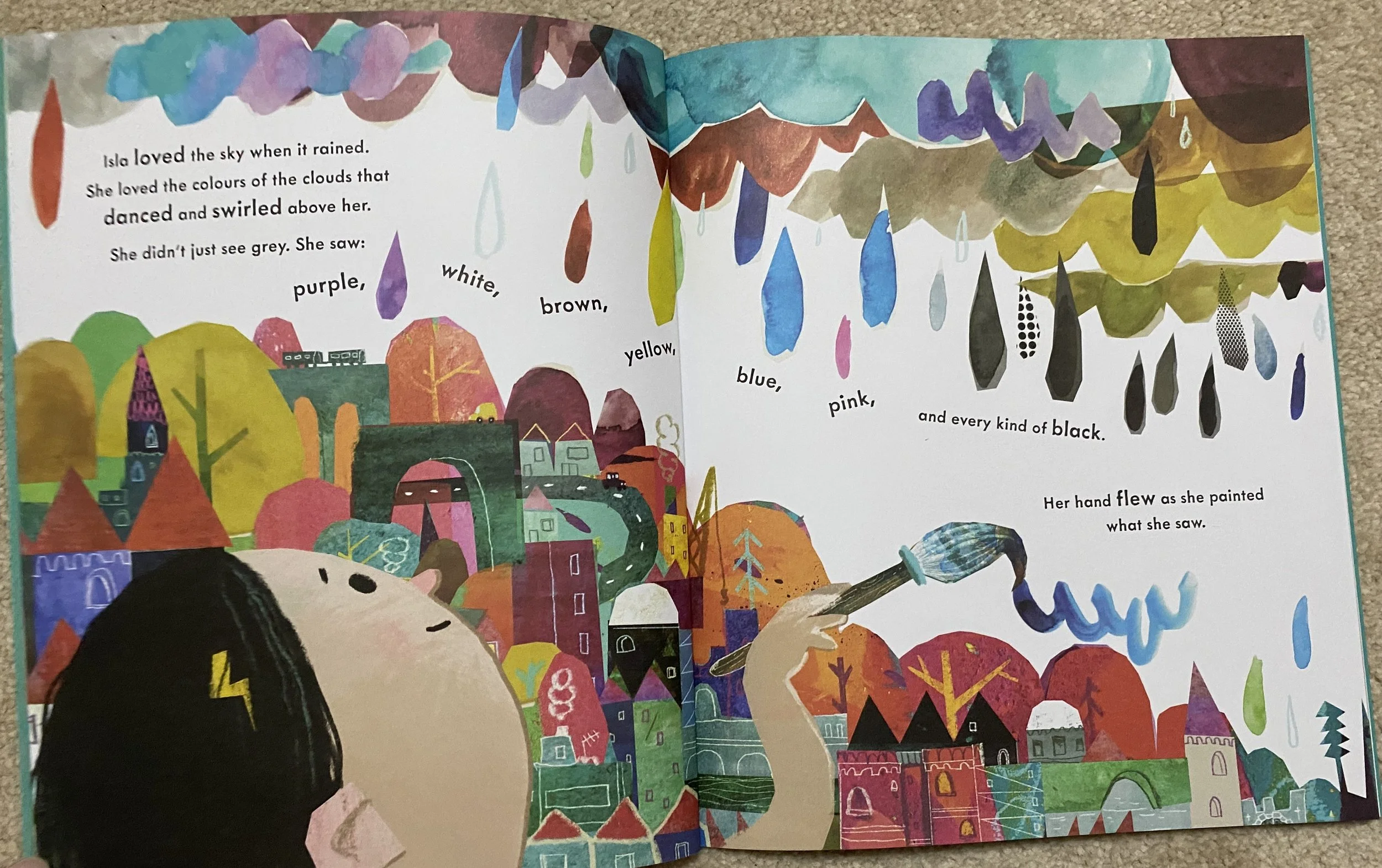 Sky is so keen to please others that when she hears people moaning about her being rainy or dull, she tries to hide her true self and act in a bright, sunny way all the time. Isla, as an artist, loves all Sky’s different moods and sees her changes as interesting and inspiring, valuing Sky however she is feeling. So many people hide themselves and put on a front to disguise how they are feeling or to make others happy and this story is perfect for exploring this, encouraging children to engage with all their emotions and accept that these are natural, not something to be ashamed of.