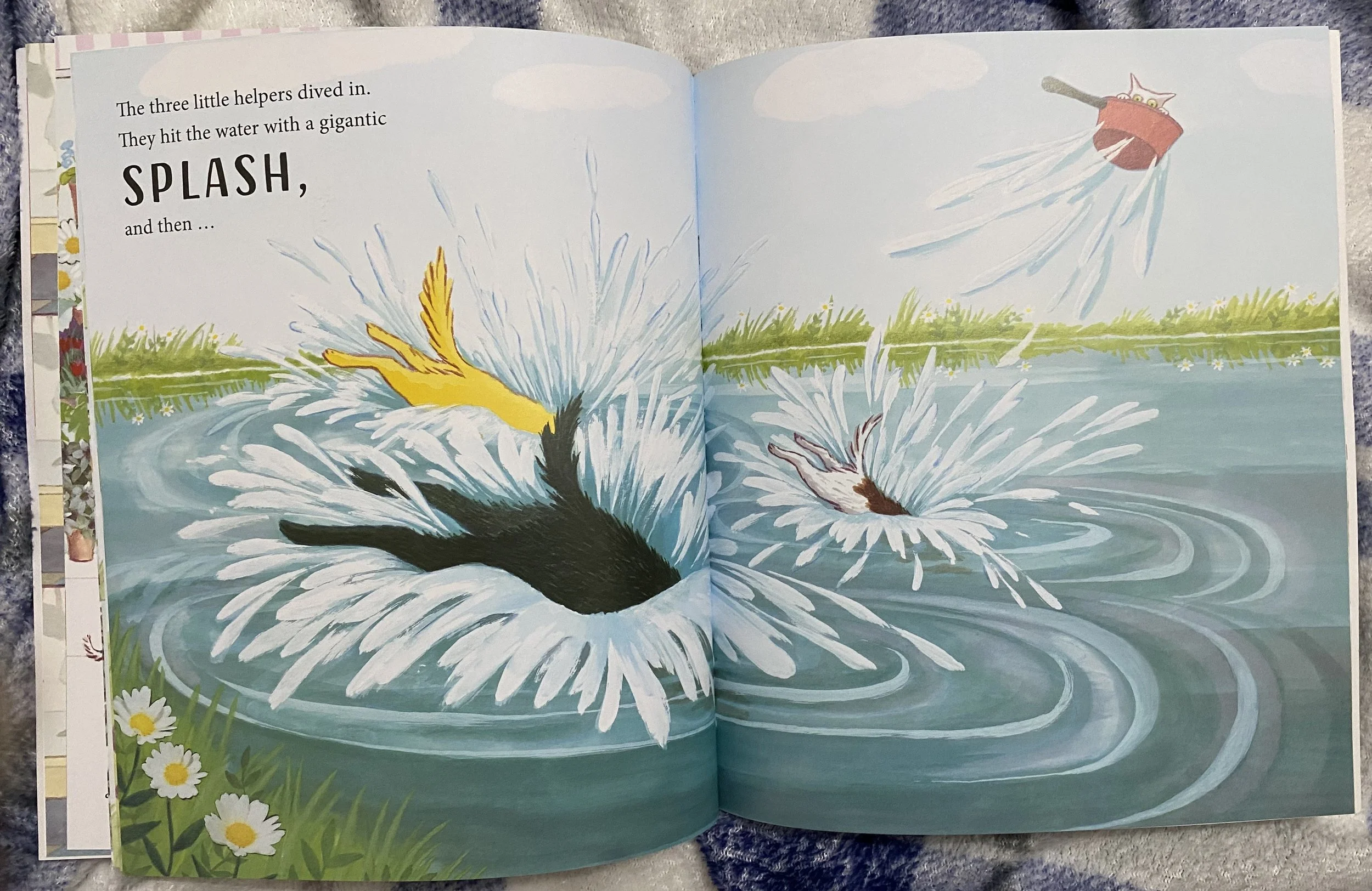 The text is perfect, building each situation with repetitive phrases leading to ‘CALAMITY!’ which will soon have listeners joining in. Little ones will enjoy predicting what will happen next as the canine pals cause mayhem and the story might help them understand why it can be important to think before you act- or ask people whether they need help. The dogs are kind and willing, but they don’t quite get it right!