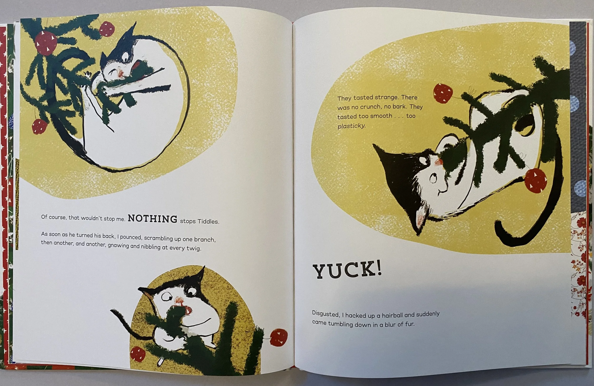 Lively, action-packed illustrations offer plenty of visual humour as Tiddles explores the tree in the most cat-like way, his insatiable cat-curiosity leading him into one pickle after another. The text offers a cat’s eye view of what’s going on, giving children even more to giggle at as they recognise things which he doesn’t- a jolly little red and white man, the shiny little balls and the winking and blinking little lights which are the final straw for Tiddles!