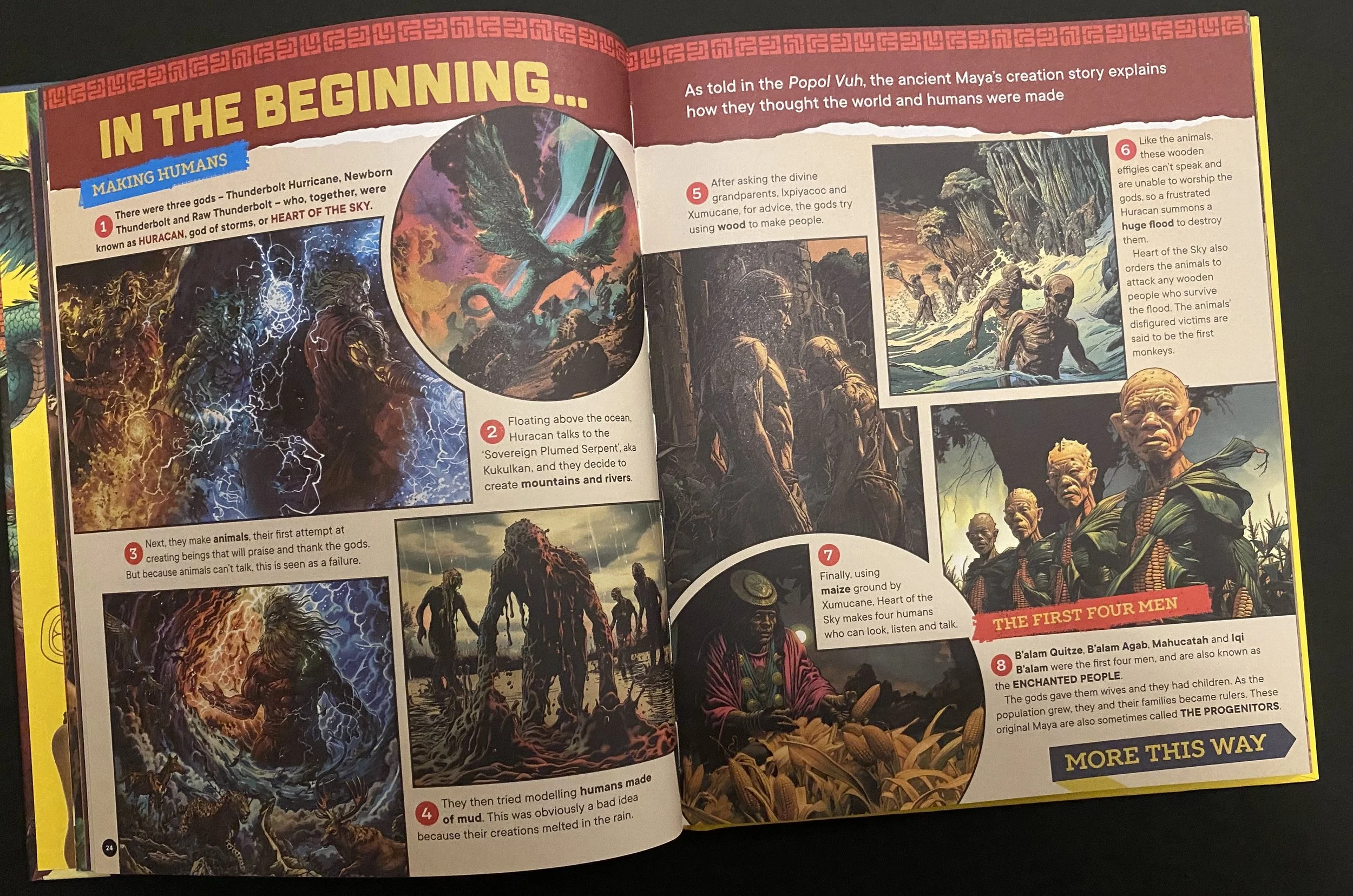 The book carefully explains the importance of the ‘Popol Vuh’, a sacred Maya text and how this survived, allowing readers today to become familiar with their origin stories and what they believed. Vivid illustrations accompany a whose who of some of the major gods before some of their myths are retold, presented in graphic form. Highly engaging, vocabulary and additional details are explained, deepening understanding of these complex stories.