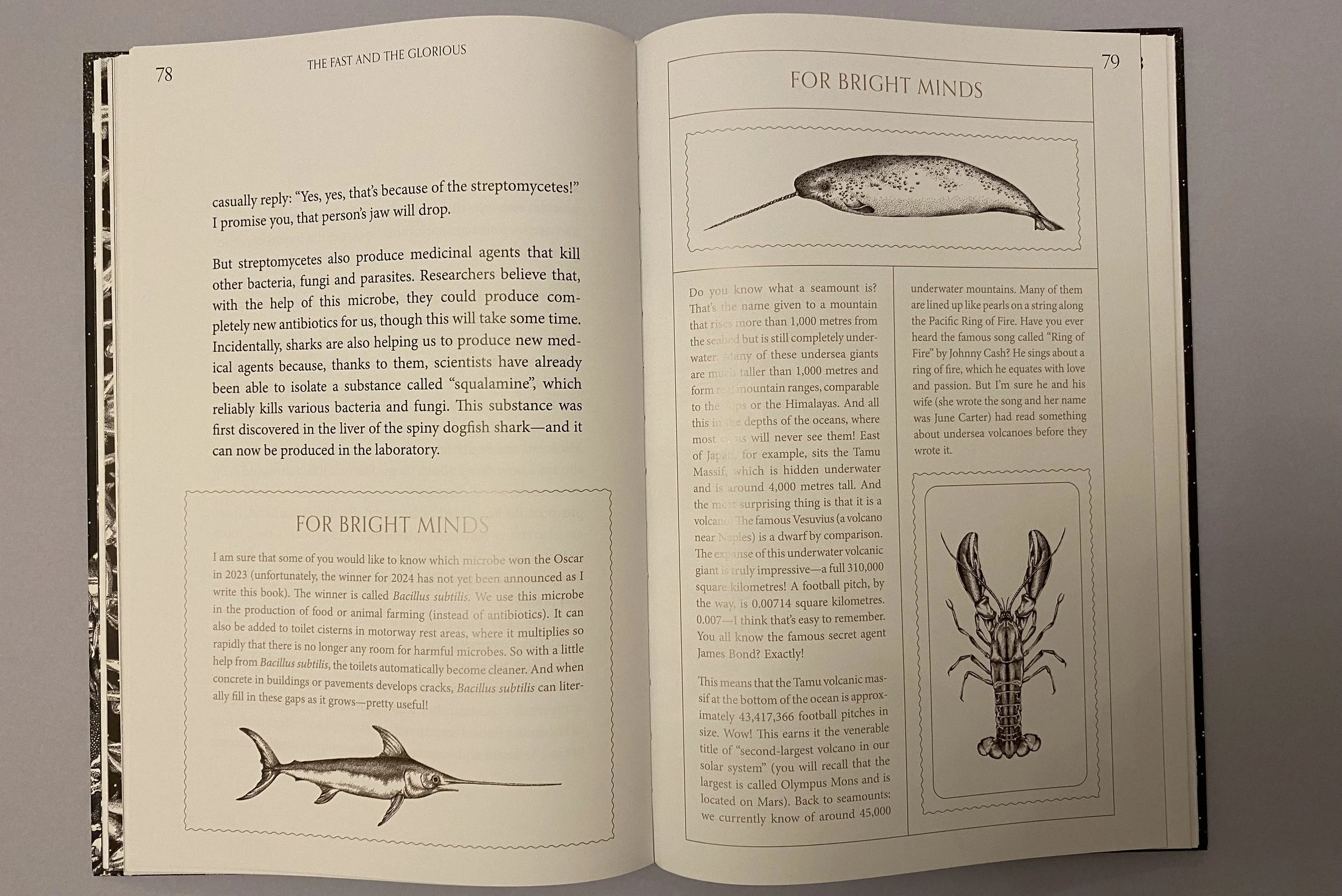 Written in a very engaging, chatty style, the author offers an amazing array of facts and figures explaining the development of sharks and the incredible number of known shark species which scientists group into eight orders. Stunning illustrations accompany the text, on occasions in response to a request from the author (Michele? Could you please draw is a 17cm megalodon tooth here? Thank you!) The author is also keen to ally fears about these incredible creatures, emphasising ways in which humans are a threat to sharks rather than the other way around.