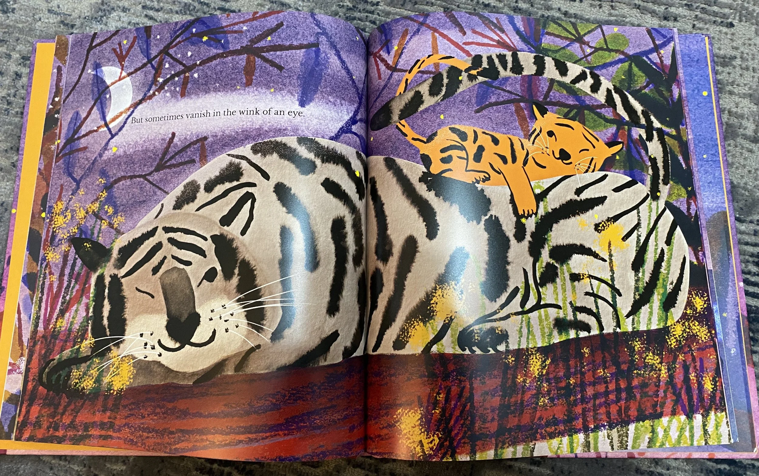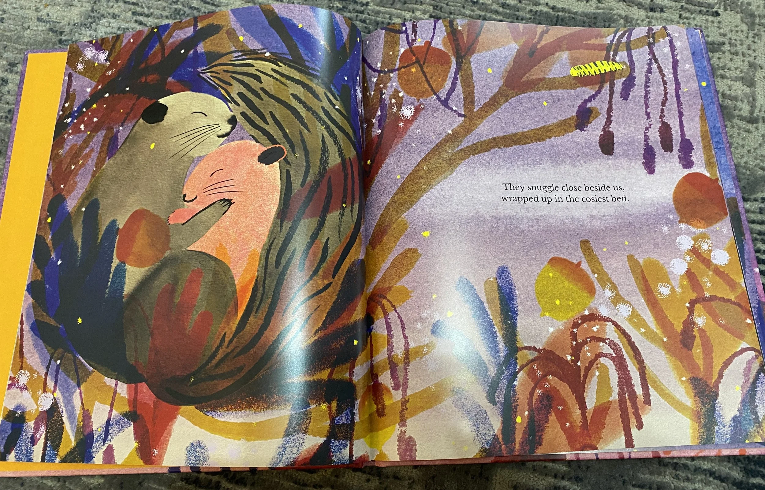 Rich purples with tinges of pink evoke evening skies creating a wonderfully calm feeling on every page. Children will enjoy naming all the animals shown peacefully sleeping and are sure to notice the creeping caterpillar which makes its way across several pages unheeded by all the slumbering creatures until it creates a cocoon on a branch and later emerges. A gatefold opens to reveal all the animals as the moths fly away.
