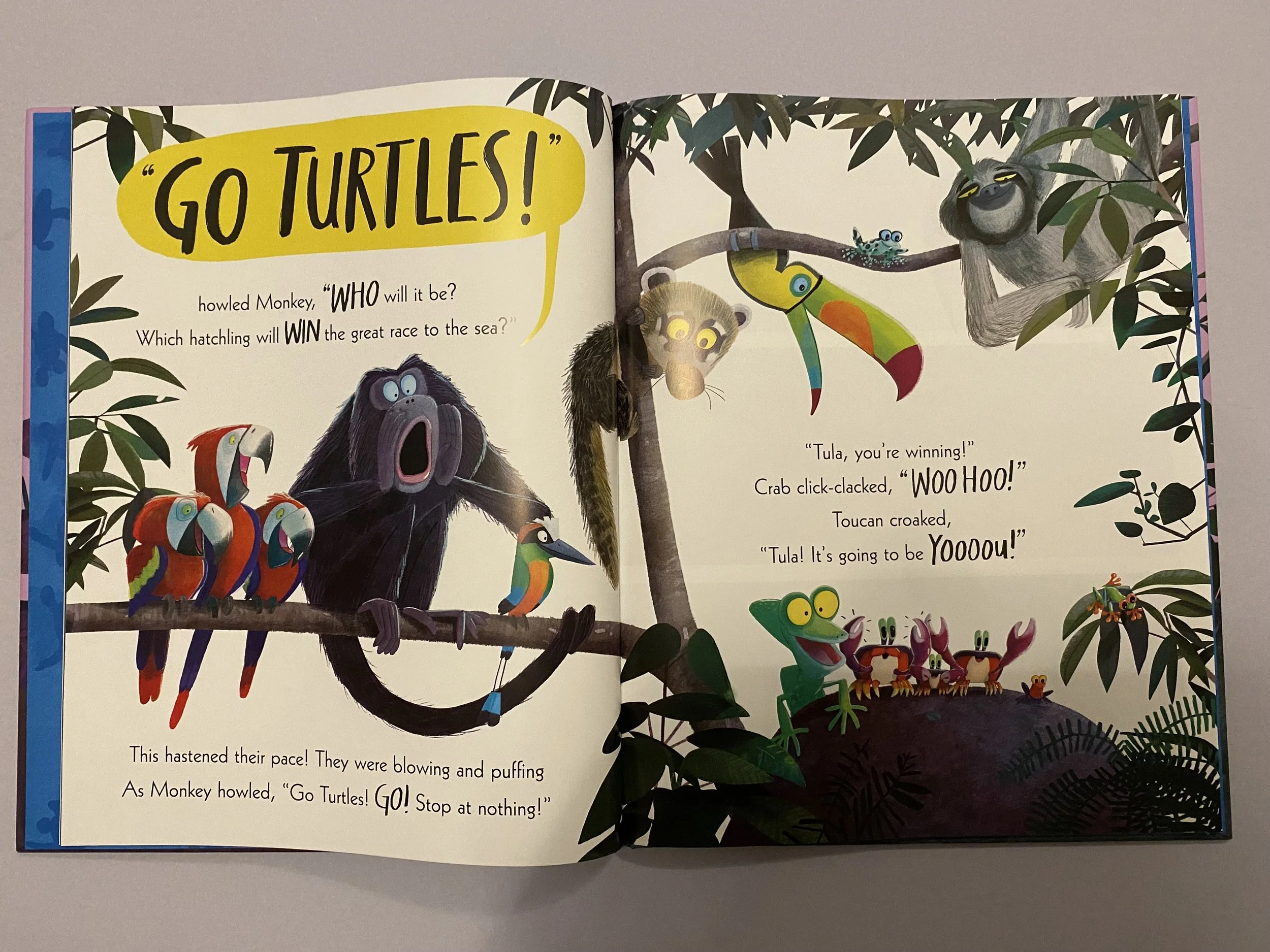 The rhyming text is an absolute joy to read aloud, rising and falling with the action of the story. Tula chooses to help her brother above winning the race, showing the importance of kindness. Her example to the other animals inspires them in turn to gather together and rally round when needed, making sure Tula and Tiny escape the jaws of Snake and happily end up in the ocean with the other baby turtles. The element of peril is very well handled with the word ‘but…’ at the bottom of the page hinting that something is going to save the siblings!