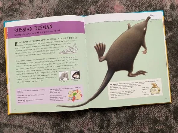 ‘Lesser Spotted Animals’ is an absolutely fascinating and eye-opening look at the natural world, delivering a powerful message, especially when sharing those animals that are endangered but whose plight (and existence) is virtually unknown to most of us. However, the book does not preach or lecture. In fact, its accessible chatty style, fact boxes and humour make it a light, easy read which would appeal to most children as it manages to be factual, engaging and funny all at once. The text is a perfect mix of scientific terminology and facts with description and anecdotes that will allow children to visualise the animals. For example, the size of each animal is described in ways such as, ‘as long as two average twelve year-olds, end-to-end,’ and, ‘about as big as a mouse – with wings.’ Alongside this are Martin Brown’s brilliant illustrations. Every page is full colour with delightful cartoon character animals, many of which have fun speech bubbles, which will have you chuckling to yourself. As well as the large illustrations, there are plentiful additional smaller pictures which will raise a smile: the sand cat in an ‘I heart sand’ t-shirt; the dagger-toothed flower bat dressed as batman; the tap-dancing black-footed ferret.