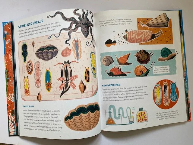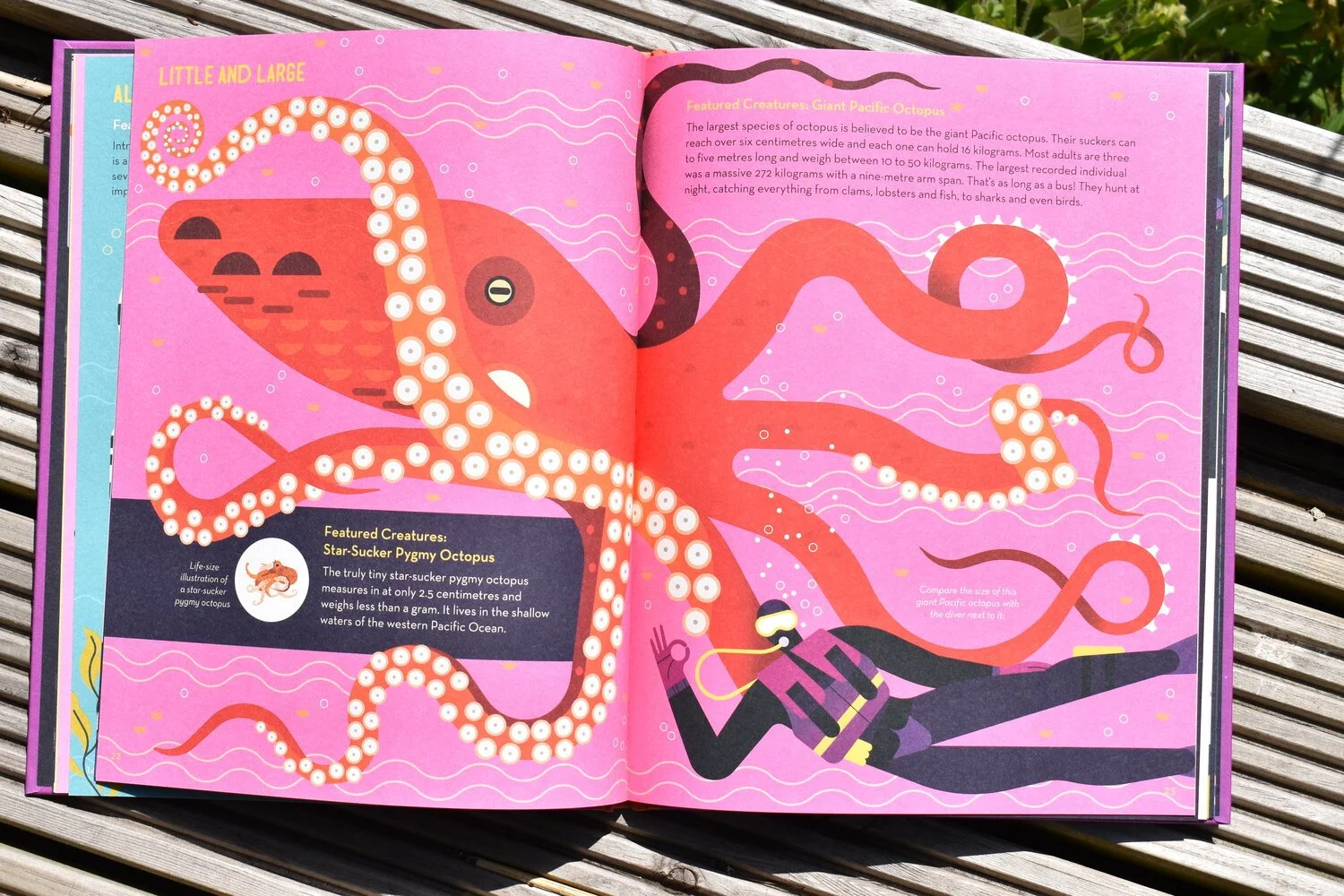 Colour is used to great advantage throughout the book, adding to the appeal. Octopuses tentacles wind their way across the pages, framing and bordering the text. There are plenty of side headings with little snippets of information on offer, making it easy to dip in and out of.