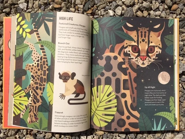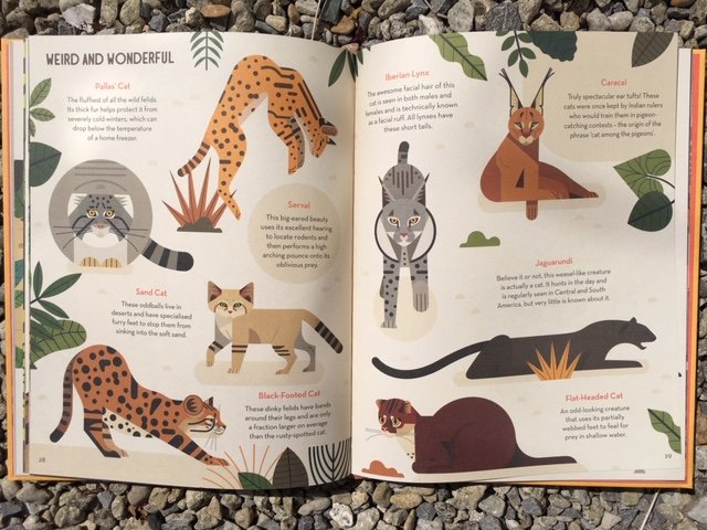 The diversity of cats in this book is wonderful, making the perfect starting point for further investigation, allowing children to compare and contrast how different cats species have adapted to their environments. The marbled cat (Pardofelis marmorata) caught my imagination - I’m ashamed to say I had never heard of it; I now know where it comes from and that it is the only species classified as ‘pardofelis’, having previously been thought to belong to the panthera lineage. Another species which leapt off the page at me was the ‘margay’. Sadly. both of these wonderful creatures are considered to be ‘near threatened’.
