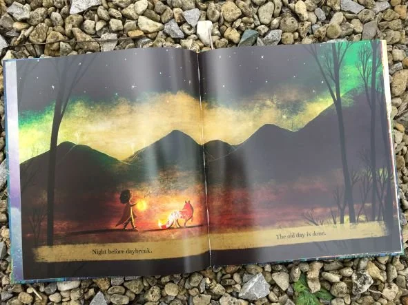 The illustrations are pure David Litchfield joy! Glowing with colour, each spread is rich in detail to explore and discuss. I don’t know whether it’s just me, but the spreads seem to be tinged with the colours of the rainbow as the story moves from the girl and her fox (red clothes and fur against the dark) to the indigo edged waves of the sea and then again from their arrival on new shores to happily dancing beneath the rainbow at the end. Wonderful for inspiring art work, the whole book is a thing of great beauty, perfect for sharing again and again.