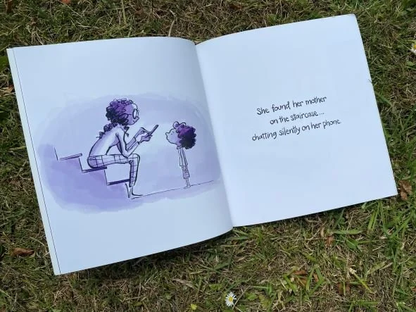 As Violet appeals to her family for help, she draws them all back together as they once more share experiences and spend time together, connecting as a family should. The illustrations are so evocative of the emotions she experiences. As he family drifts apart and she feels lonely, shades of purple (or violet!) are used to capture the weight of her feelings whilst her joyful memories are in full colour, vividly standing out against the white of the page. Once her family reconnects, jubilant colour returns once more, even spilling over onto the end papers. The final picture is a complete joy as the family gathers round the table once more, sharing their meal, laughing and enjoying being together. Mum is even sneaking food to the dog under the table!