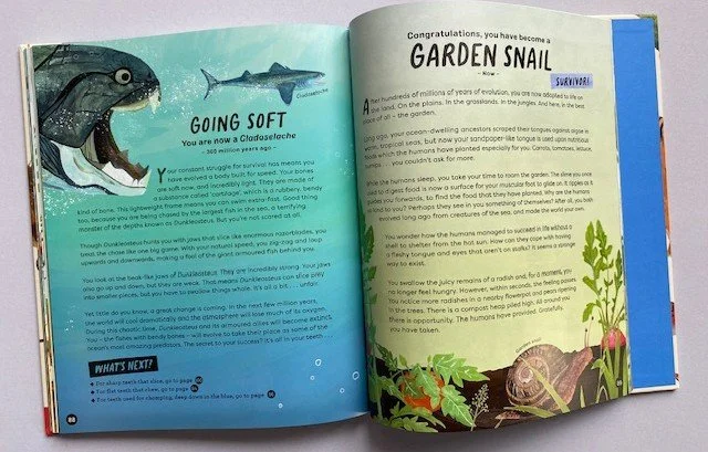 ‘The Journey’ Begins’ sets the scene, explaining that every animal has a secret history- their evolution - and that readers will be offered choices to decide their fate. Starting as a Dickinsonia, a tiny blob, three pathways are offered to set off on the evolutionary journey. Deciding that slime is my ‘style’, led to becoming a ‘Helcionellid’ where, faced with five further choices, I selected ‘Get ahead of the game’ and turned to page 89. Here, I learned that I was a survivor, having become a garden snail! However, some pathways lead to extinction, the fate of Megalodon or Titanoboa, making this an interactive and engaging read, allowing readers to learn without realising!