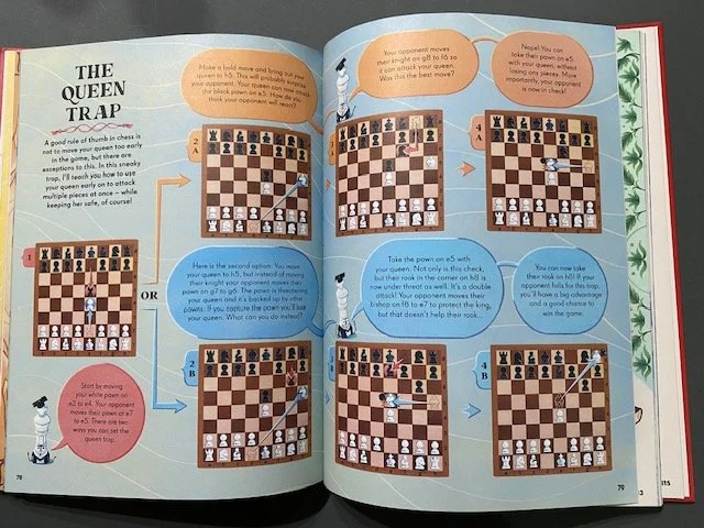 Comical chess pieces full of personality introduce the reader to how they can move, their value in a game and their strengths and weaknesses. All the information is clearly presented with humour, making it engaging and easy to follow. The author then moves on the explain some of the technical terminology connected to the game, supported by diagrams which offer further explanation. Everything is fully explained and at a pace which allows readers to fully absorb each point before moving on.