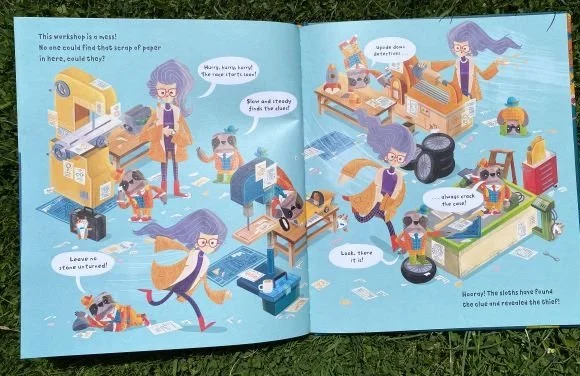 Quite simply- superb! ‘The Upside Down Detective Agency’ is a light-hearted romp of a read which engages children (and adults!) from the very first page. Illustrations and text combine to make a wonderfully immersive read which will be fun to share again and again. The reader has to use their ‘detective’ skills to help super-sleuth sloths, Stella and Stan, solve the mystery of who has stolen Lady Veronica Velocity Speed’s warp drive. Each spread poses a challenge to be solved, encouraging the reader to read/listen carefully to what they need to do and then really focus on the illustrations to locate the clues or solve questions. The first clues help solve which sloth is Stella and which Stan before the mystery ‘proper’ begins.