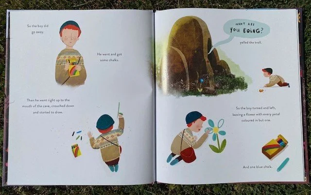 Everybody is so used to avoiding the bad-tempered troll which lives in the cave that they forget all about it. Everybody except for one boy who is determined to reach out and make friends. The boy collects his chalks and draws a flower, leaving one petal uncoloured. The following day, he returns and finds the petal coloured in- yet still the troll will not leave the cave. Day-by-day he returns, leaving his drawings incomplete for the troll to finish. At last, the troll leaves the cave and is revealed to be a boy who joins in with the other children.