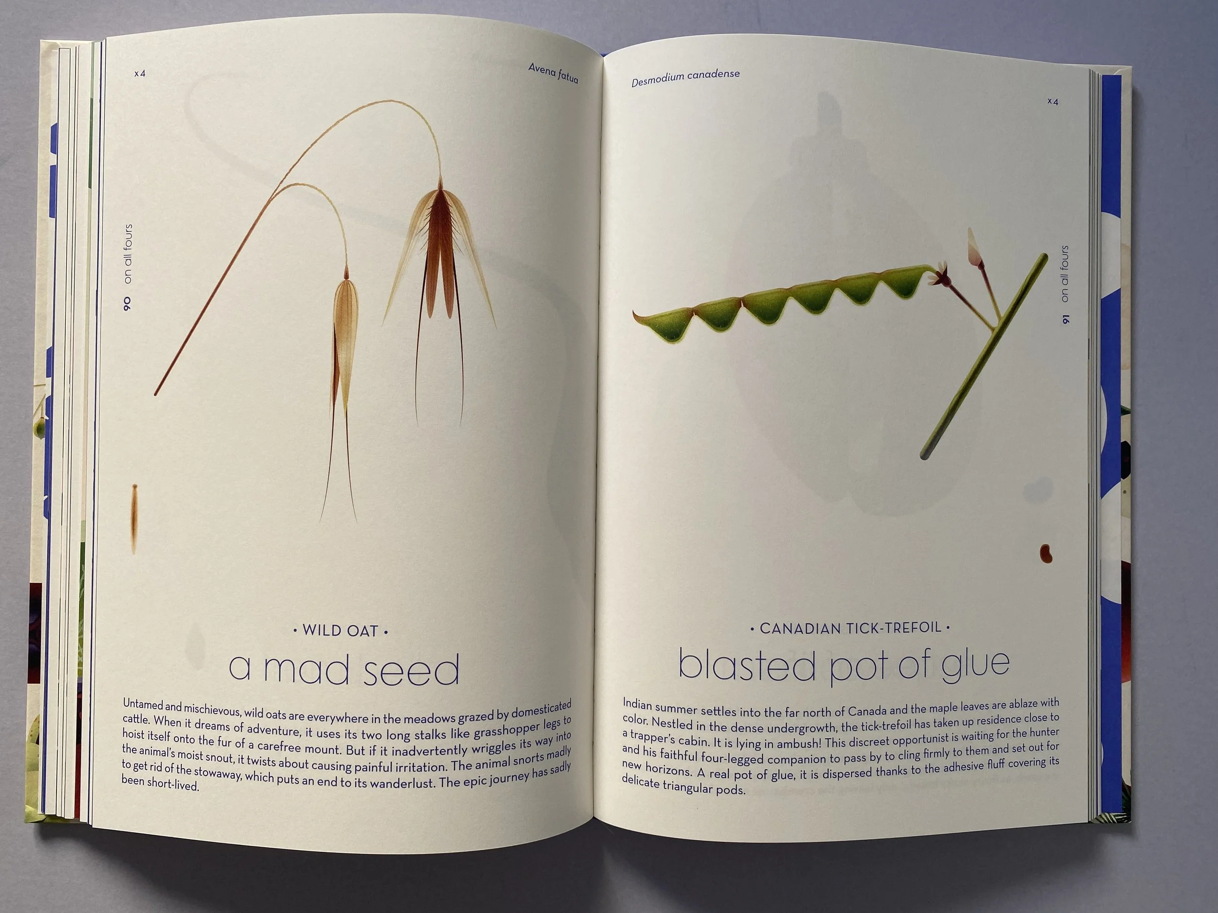 The illustrations are simply stunning, each one a work of art. Arranged in sections which reflect how they are dispersed, each seed is given a page of its own which offers information beneath the illustration. The binomial classification for each plant is given in the top corner of each page and a ‘multiplied by’ is given to indicate the seeds original size.