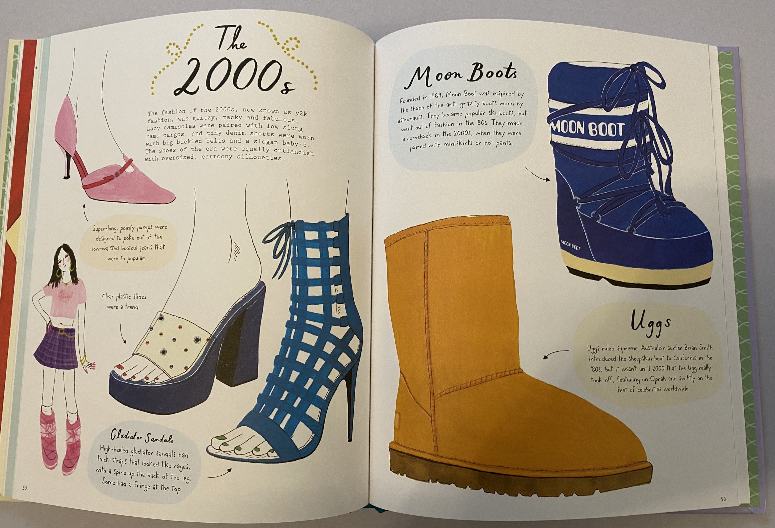 In the opening chapter, ‘Shoes! (and why we love them) explores the perennial appeal of footwear before looking at early shoes from around the world and then those favoured in the Victorian era, including the first pair of boots with an elastic side gusset, presented to Queen Victoria in 1937. The anatomy of a shoe, different types of heels and some of the ‘classic’ shoe styles are shown all accompanied by colourful illustrations.