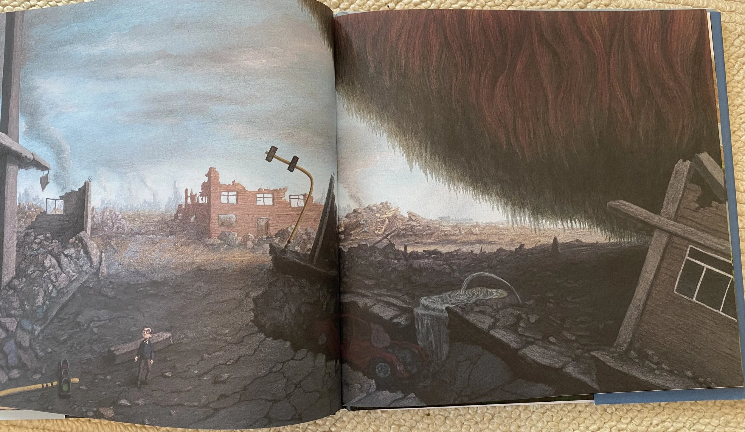 Genial, but hungry, the giant, once woken from his slumber, is moved by Victor’s tears and is happy to rectify the situation in return for a milky hot chocolate. Children will appreciate Victor’s tactics as he wakes the giant by pulling out one of his nose hairs and then tickles his tonsils to get his mother and the city back. The illustrations allow readers to ‘admire’ every hair, lump and bump on the giant’s skin and in his mouth and shows the regurgitated city covered in slime, all of which is sure to make children squeal in delight! Other illustrations emphasise how tiny Victor is in comparison to the giant and children will enjoy spotting his tiny figure as he tries to appeal to his huge adversary.