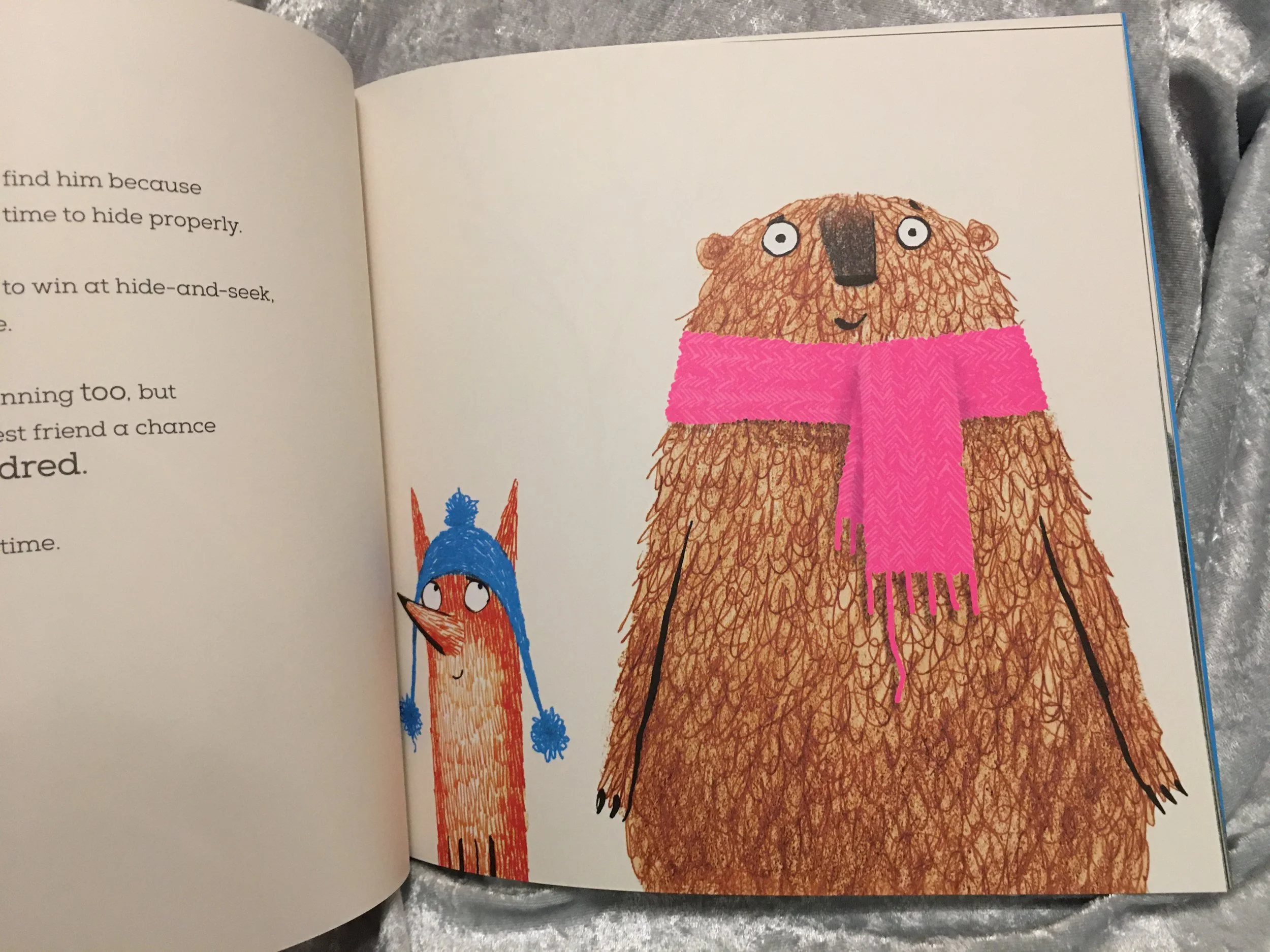 The pictures are full of humour! Children will giggle at Bert’s attempts at hiding and really enjoy the little twist at the end which shows that perhaps Bert is not as clueless as he first appears! His bright pink scarf suits him perfectly and it’s wonderful to see Frank knitting for his friend. Their expressions are just wonderful, adding to their personalities!