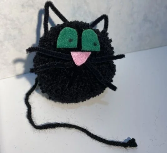 A beautiful black cat with bright green eyes, Wilbur makes a purr-fect pompom pet! Using a medium sized pompom maker (or homemade ones from circles of card), firmly wrap black wool around each section. Do this as evenly and as fully as possible to make the best pompom. Tightly tie the pompom off around the middle leaving two reasonably long tails of wool and then tie another strand of wool around the middle of the pompom so that there are three longish strands altogether. Plait these pieces of wool to create Wilbur’s tail, cutting and tying it off to the required length. Next, cut two eyes from green felt and use a black marker pen to add the pupils. Take a black pipe cleaner and bend one end into a ‘v’ shape which gives Wilbur the size of ears you feel he should have and cut this off. Cut a second matching ear from the rest of the pipe cleaner. In pink felt, cut a nose shape and use more lengths of pipe cleaner to create whiskers. Glue all the pieces in place to make your own Wilbur!