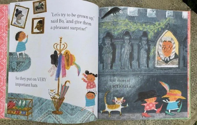 So begins this delightful romp of a story in which, full of the exuberance of youth, siblings Bo and Smudge, are constantly being told ‘Don’t be silly!’ by all the grown-ups around them. Even when they try to act like adults, donning serious hats and big shoes, they still fail to impress. However, a visit to their grandparents changes everything as the greeting they receive on arrival is the opposite of the boring one they expected!