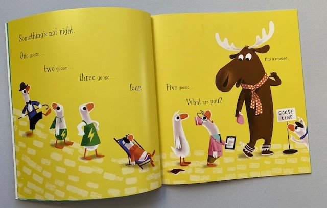 Stories like this are a complete joy to read aloud. Children- whether in a class or at home- will delight in joining in the fun, giggling at the antics of moose and geese as Simon’s frustration mounts! The visual humour of a moose standing in the goose line will set them off before the text gets there by which time they will be eagerly anticipating the next ‘count’ to the familiar pattern of ‘one potato, two potato’ with its inevitable interruptions! The ending is suitably satisfying and funny with the illustrations adding much to the humour.