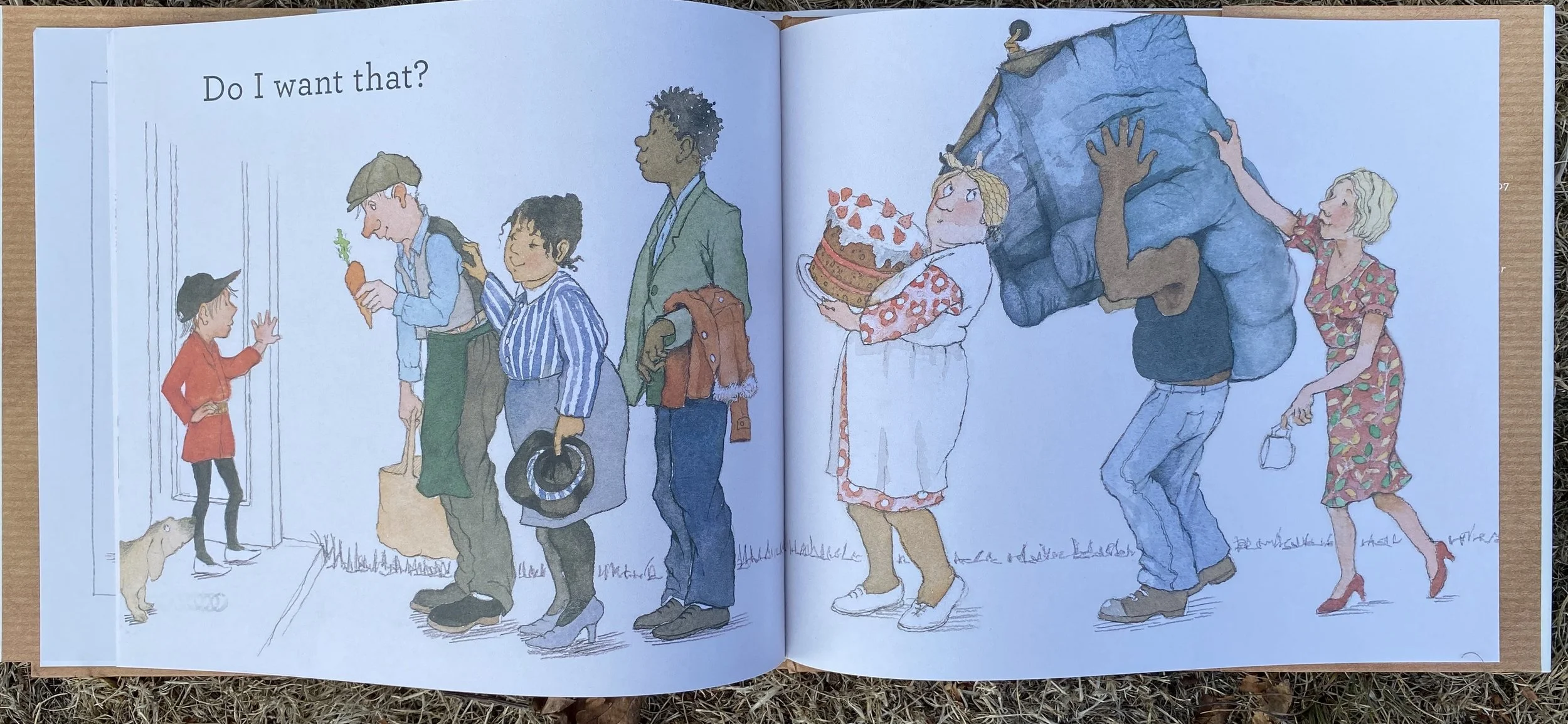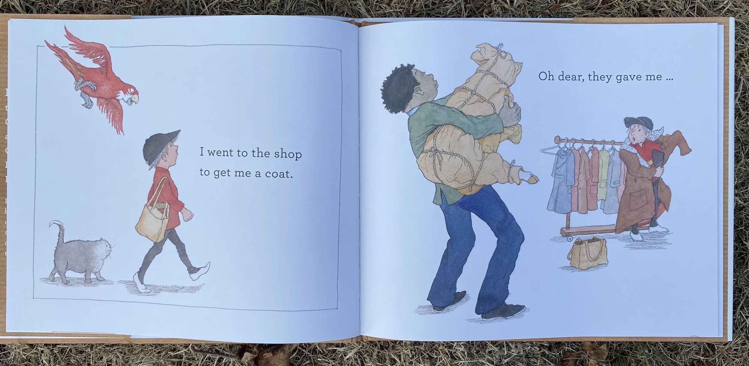 A child sets out to the shop in search of a carrot, but finds he has been sold a parrot. ‘Oh dear, look what I got! Do I want that? No, I do not!’, he cries. Off he goes once more in search of a hat…and comes home with a cat! And so the story continues until an unexpected puppy causes chaos. When the doorbell rings, all the shopkeepers are at the door, bearing the items which has been originally requested, leading to an impromptu party!