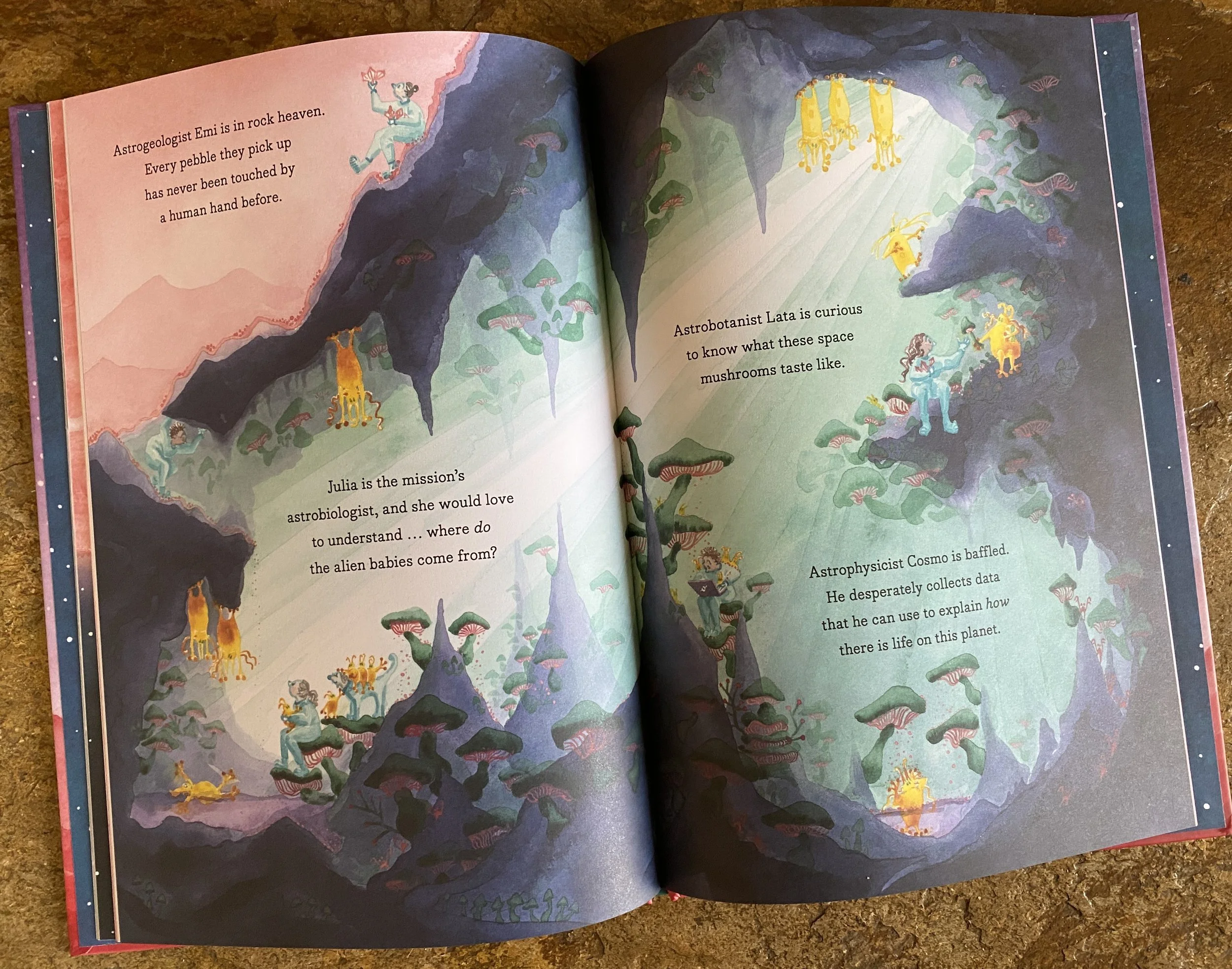 The delicately coloured illustrations burst with beguiling details, making the book a joy to linger over and explore. Cross sectional diagrams of the spaceship allow readers to observe life on board ship whilst other illustrations allow readers to be in on the joke and notice that there is life on this ‘desolate wasteland’ before the crew does. The spaceship itself is oddly human, its ‘face’ reflecting a whole range of emotions as the adventure continues.