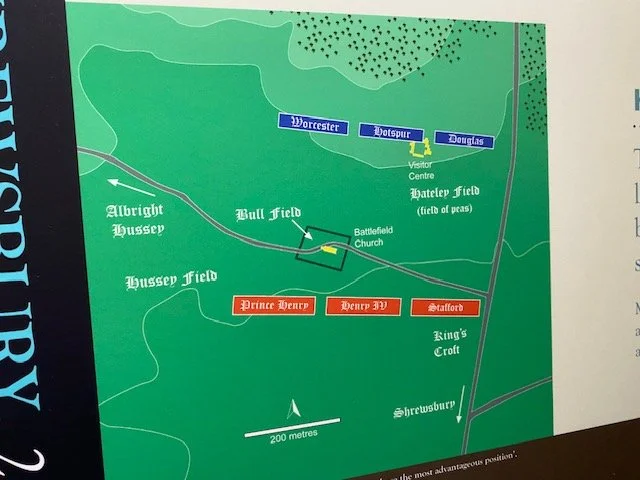 Today, the battlefield remains almost wholly undeveloped agricultural land, with the Shrewsbury by-pass crossing the very southern edge along the probable line of Henry’s deployment. We intended to walk from the car park along the path to the church and then to the exhibition, but the ground was so muddy that this idea quickly lost its appeal!